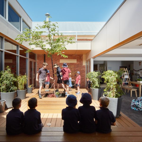 e+ architecture designed a floating glass and steel insert building between the pre mentioned hall and existing redbrick classroom block. This housed the common/flexible area, staff offices and kitchenette. The threshold between this space and the Parish Hall has been conceptualised as a forest edge identifying a shift in experience moving from one space to another. 4 smaller general purpose learning areas (classrooms) neatly sit within the existing Parish Hall with operable sliding acoustic walls separating the spaces. Highlight glazing ensures the existing proportions of the hall can still be experienced when within the space with the pressed metal ceilings featuring throughout. The existing Parish Hall underwent a full restoration with a new structural roof and galvanised cladding setting off the hall.